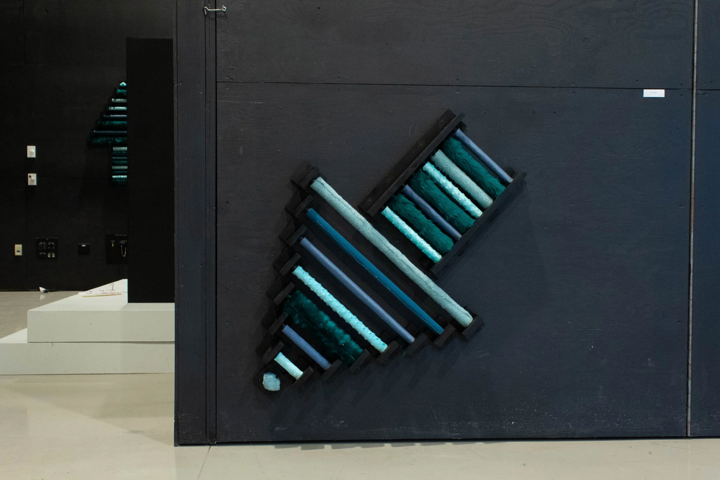 Movement Between is a tactiley engaging installation and sensory experience which is composed of individual roller units that are wrapped in different textures and are arranged to form three arrows throughout the room it is installed in. The three arrows all pay careful attention to point out the empty spaces, away from all other exhibited works around them or important features. Without pointing out anything in particular, this work takes up space in order to encourage exploration of the environment and what is found to fall between. There is a goal for those who interact with the work not only to observe how they situate themselves in the room and amongst other people, but also to recognize how others attempt to do so in a way that is comfortable for them. Everyone is able to fit in different places, just in different ways.