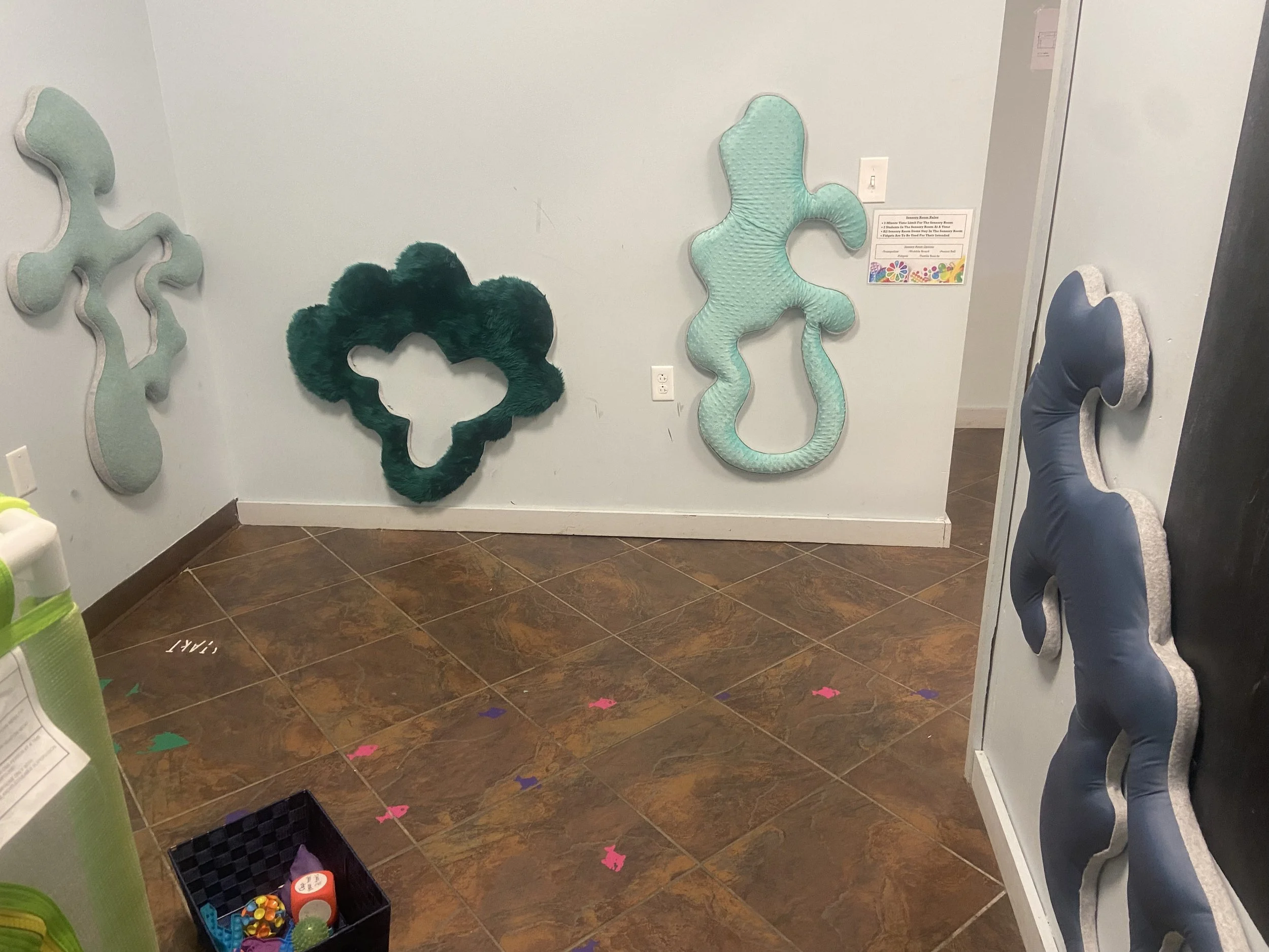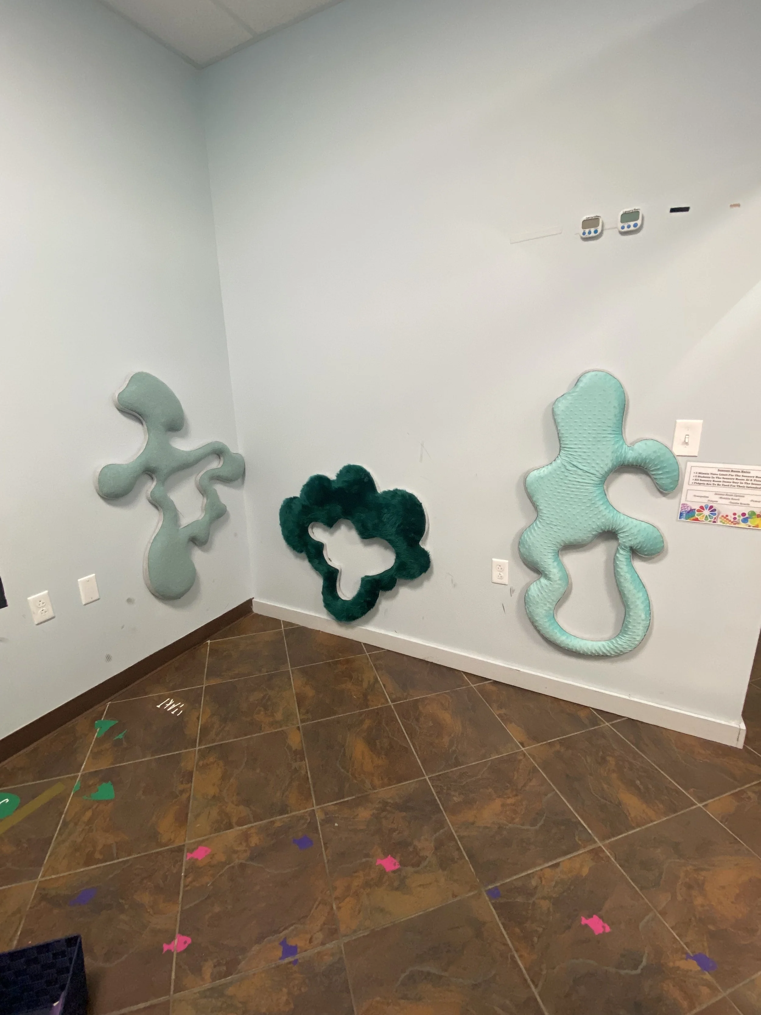 Sensation is a collection of five custom sensory boards each in their own abstract shape and upholstered in a uniquely textured fabric choice with a companion pillow made to match each cutout in the middle of the board. The boards were and are hung and displayed at different heights and in different locations to welcome as wide of an audience to comfortably play. Boards and pillows are moveable to play as near or as far as one would like. The addition of the pillows made to fit each board provide a comfort item and play item that could even travel outside the anticipated operating zone of the work to involve someone who may be too shy or perhaps overstimulated to otherwise enter. While pillow shapes and materials match a specific board, it is not fixed to a set location.